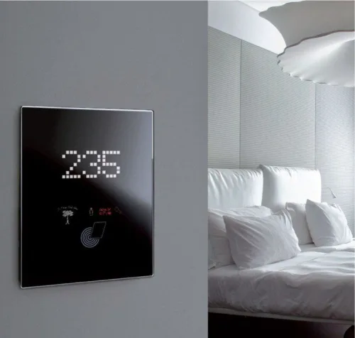 سیستم هوشمند گزینه ای بسیار ایده آل برای مدیریت اتاقها، سوئیتها و مشاعات یک هتل بین المللی و با استاندارد جهانی می باشد. در هر اتاق یا سوئیت کلیدهای ترموستاتیک چندکناره در فضاها و یا حتی کنار سرتختها نصب میشود. مراجعین میتوانند از طریق این کلیدهای هوشمند سیستم سرمایش/ گرمایش، پرده برقی و روشنایی ها را کنترل کنند. امکان نصب لیبلهای استاندار هتلی بر روی هر کلید این امکان را می دهد تا مراجعین هتل از هر کشور و هر زبان بتوانند با این کلیدها به سادگی کار کنند. با وارد کردن کارت هتل در هر اتاق، سناریو خوش آمدگوی (Welcoming) به صورت خودکار اجرا می شود. بدین ترتیب چراغهای ورودی روشن شده، کلیدها و ترموستات فعال میگردد و فیلم خوش آمدگوی از تلویزیون پخش می شود. هنگام ترک اتاق نیز با برداشتن کارت هتلی همه چراغها و ترموستات خاموش می شوند، پرده برقی بسته شده و پس از چند ثانیه چراغ ورودی خاموش می شود تا فرصت ترک به ساکنین داده شود.